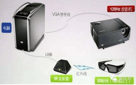 主动立体显示原理如上图所示。由图形工作站、IR发射器、3D眼镜以及120Hz的投影机组成。